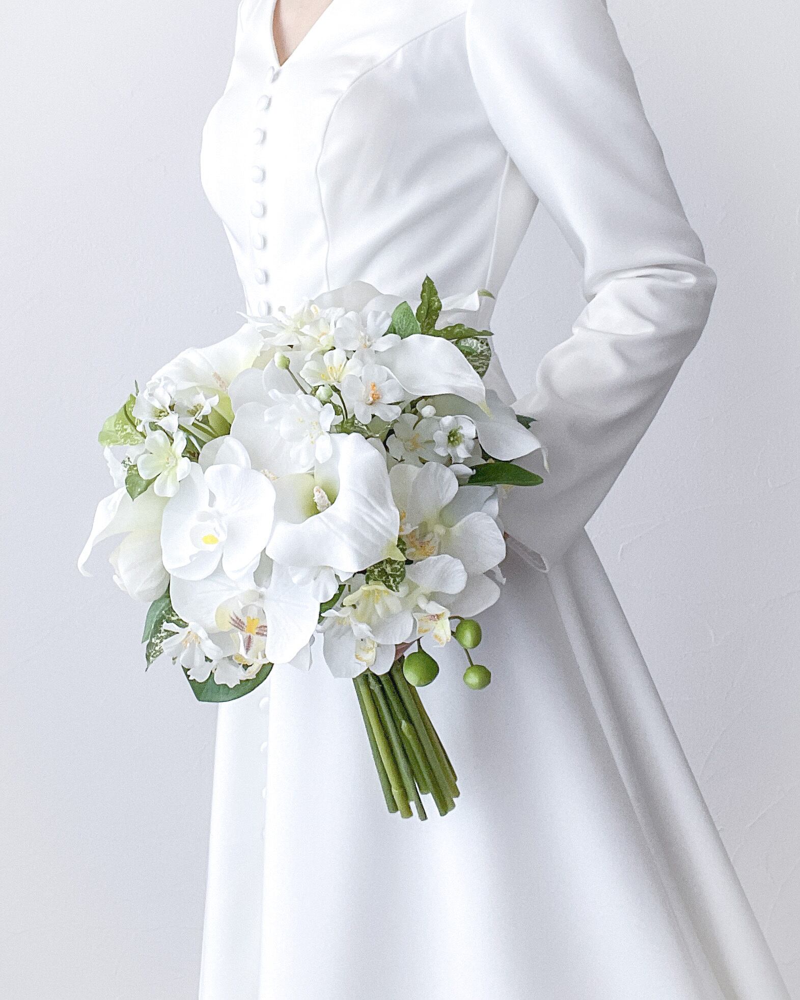 シックで大人っぽいカラーと幸せが舞い降りると言われる胡蝶蘭をふんわりと優しく束ねました。カラーも胡蝶蘭もそれぞれ大きさの異なる3種類のお花を使い表情豊かに仕上げました。白色の小花が可愛らしさをプラス。挙式はもちろんパーティーなどでも花嫁様を上品に彩ってくれます。リボンはホワイトのサテンリボンでお仕立てします。
