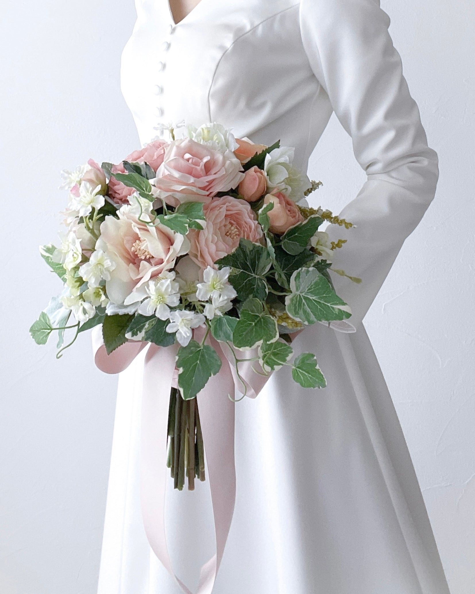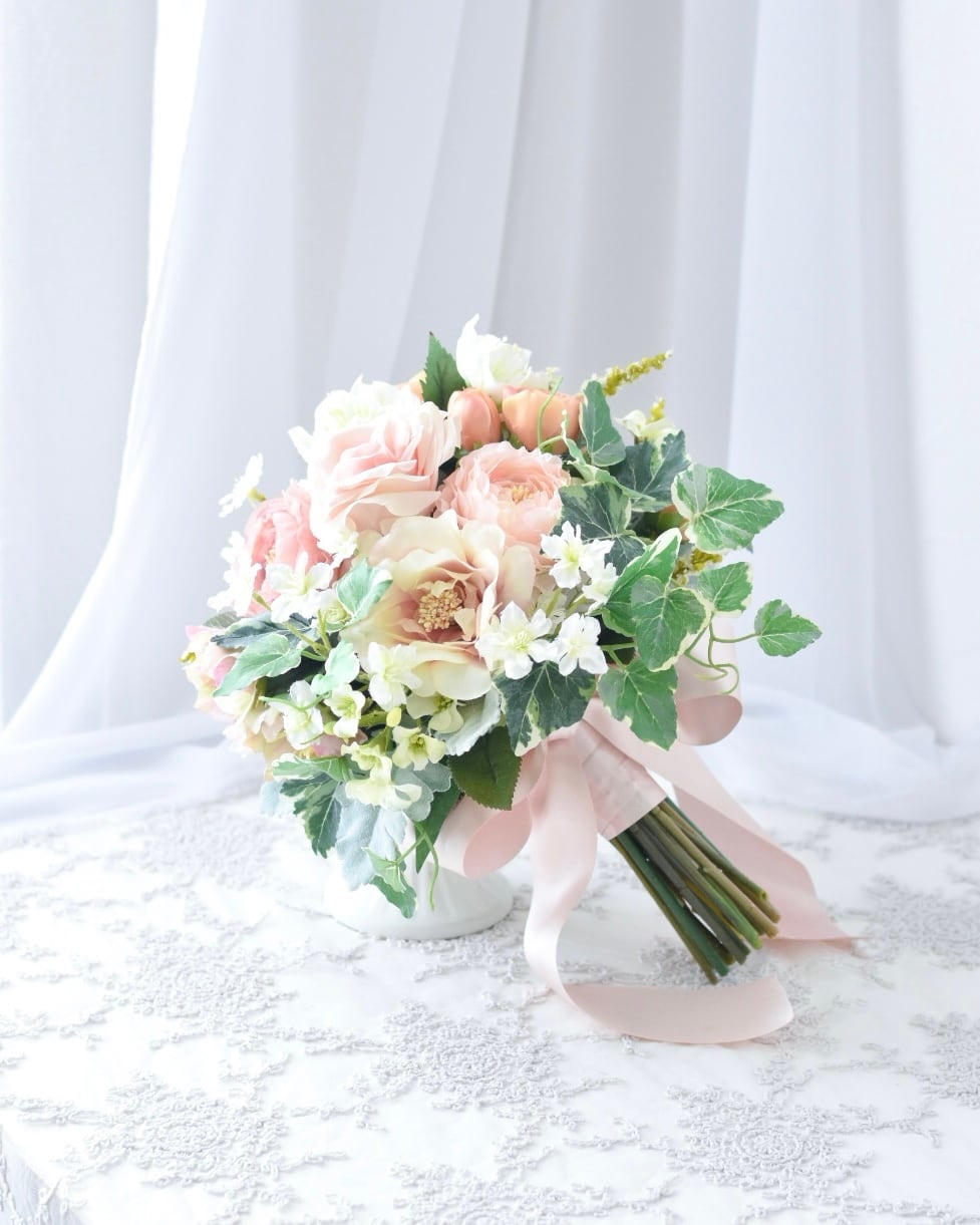 レンタルブーケとして使用した作品です。オーダーメイド作品・完成品作品と同じ品質で制作、花嫁様から花嫁様へ幸せを紡いだアーティフィシャルフラワーのウェデイングブーケ。消毒をして綺麗にお手入れを済ませ、リボンは新しく取り替えてお届けいたします。レンタル作品入れ替えのためUsed作品として販売いたします。1回のレンタル料金よりお得にお求め頂けます。ご使用後は大切な日の思い出としてお部屋に飾ってお楽しみください。