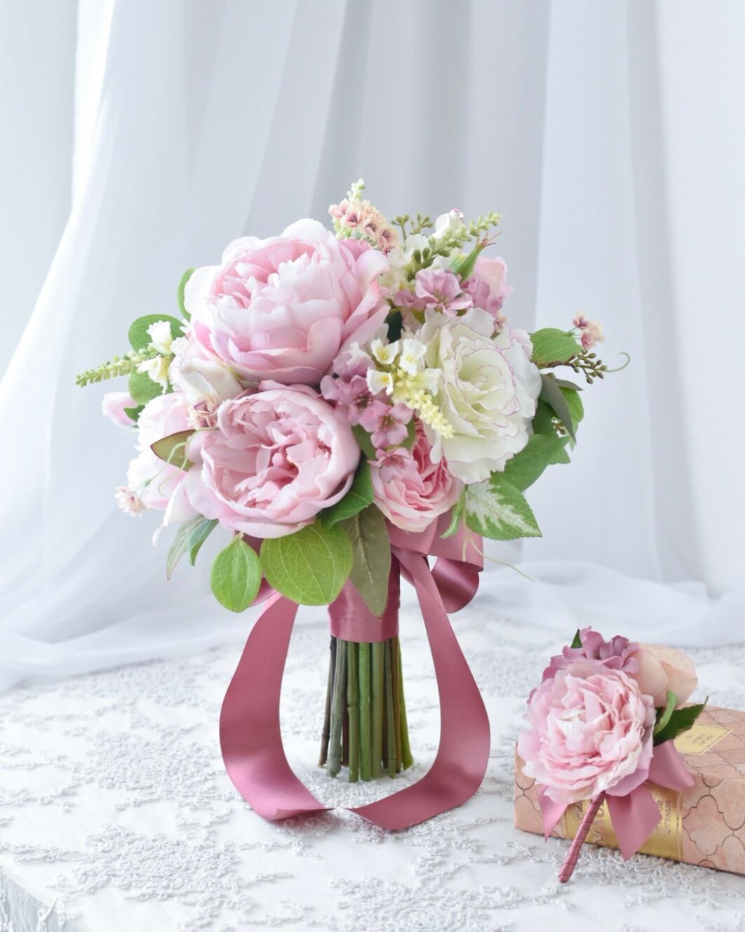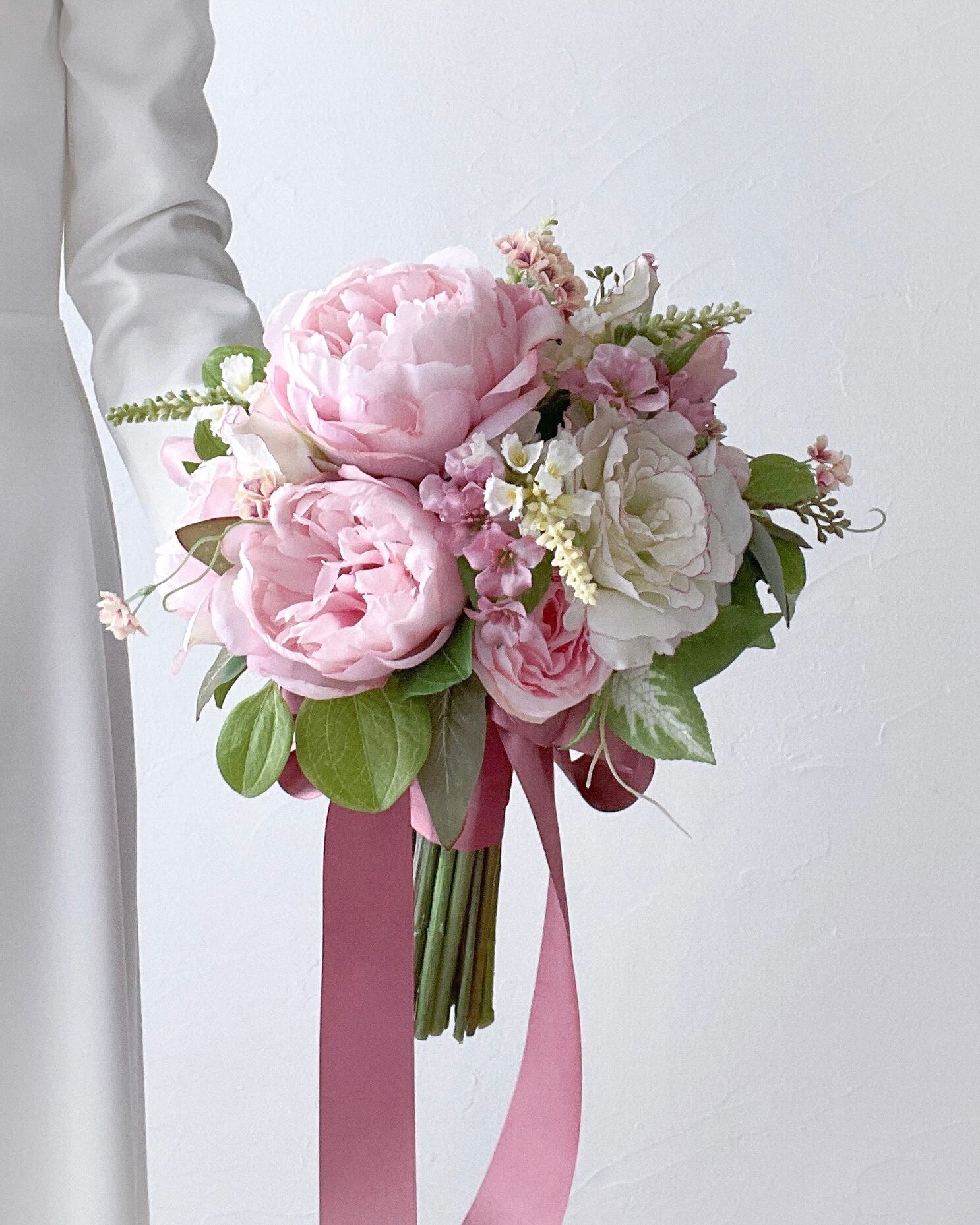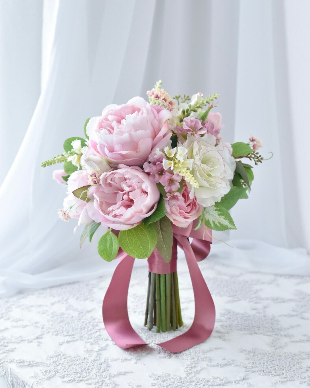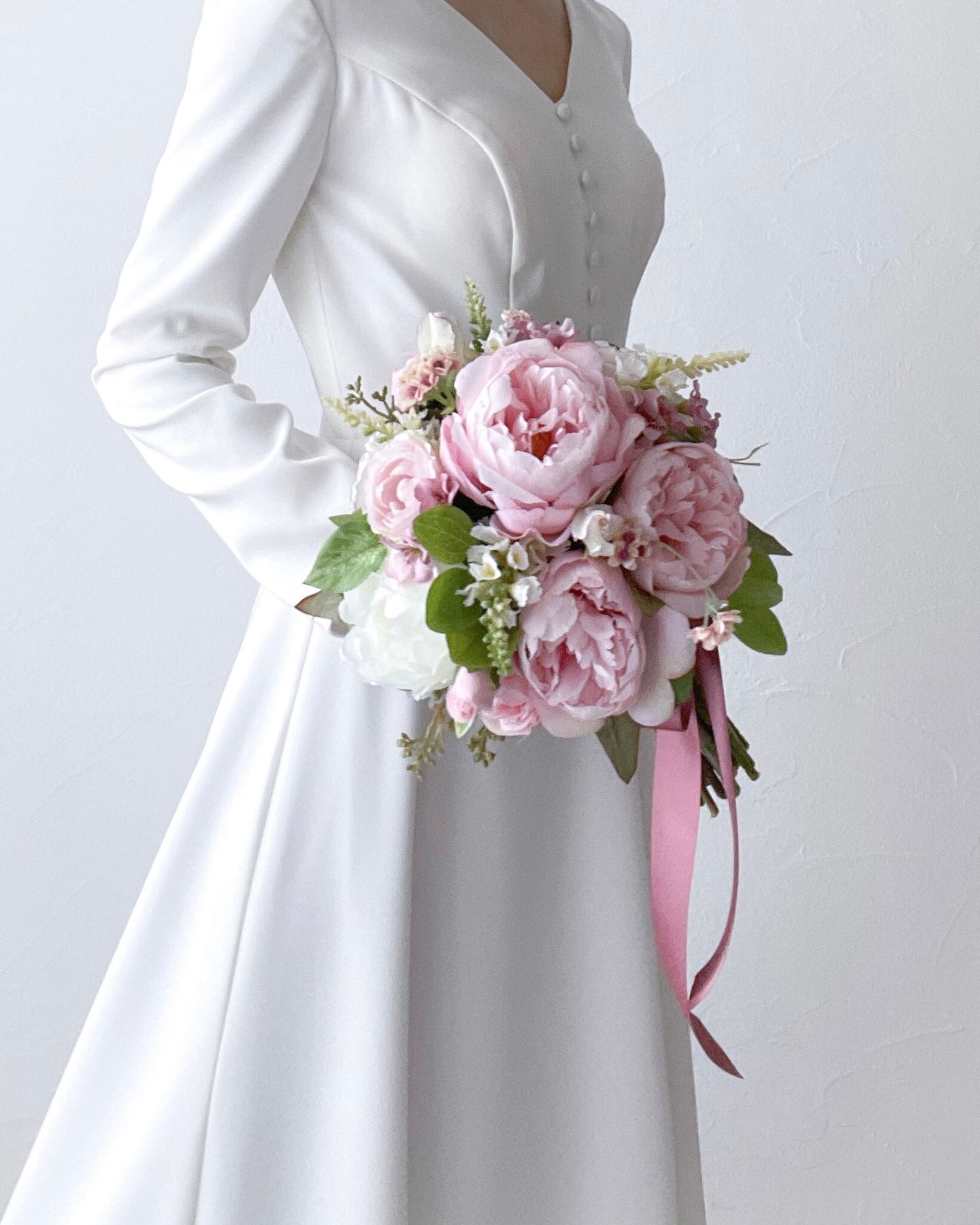 ふんわりふわふわを表すフラフィーという言葉はこの芍薬のブーケにぴったりです。上品なピンク色の柔らかな花びらからは幸せが溢れ出て、ブーケを持たれる花嫁様もゲストの皆様も優しさに包まれる事でしょう。