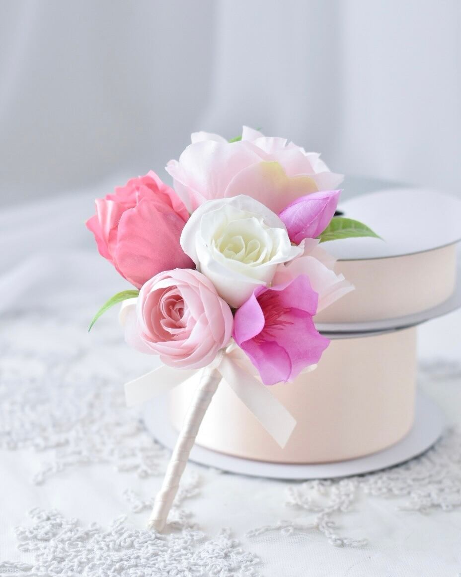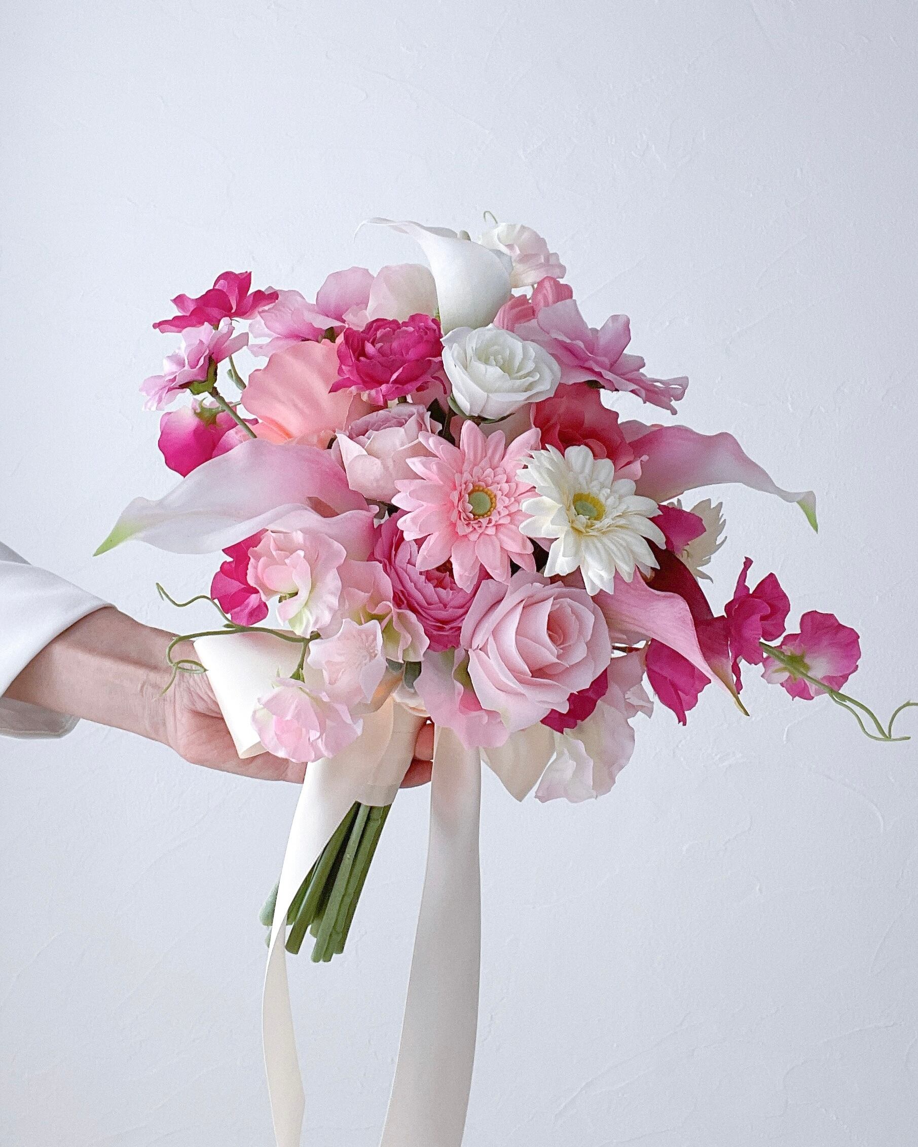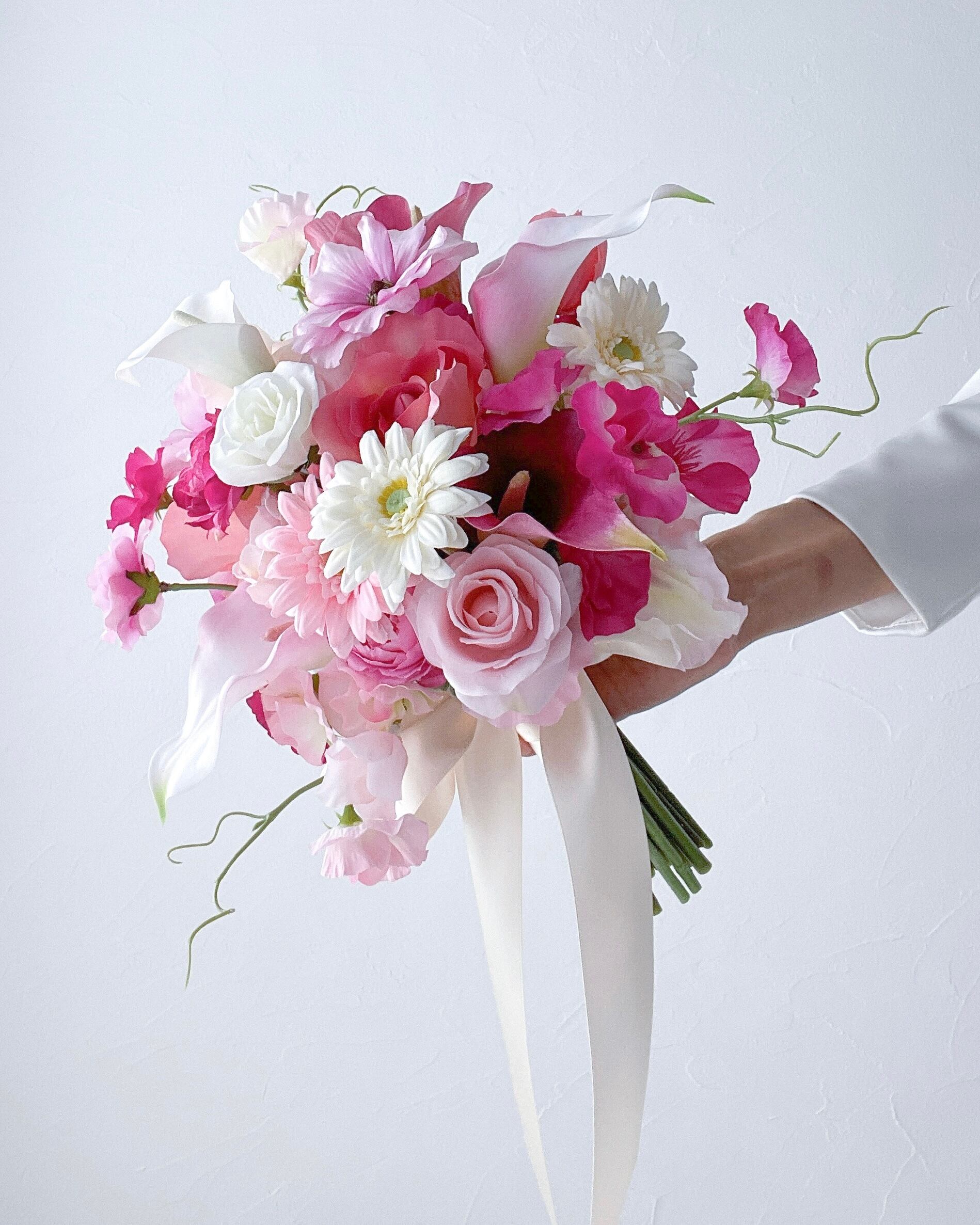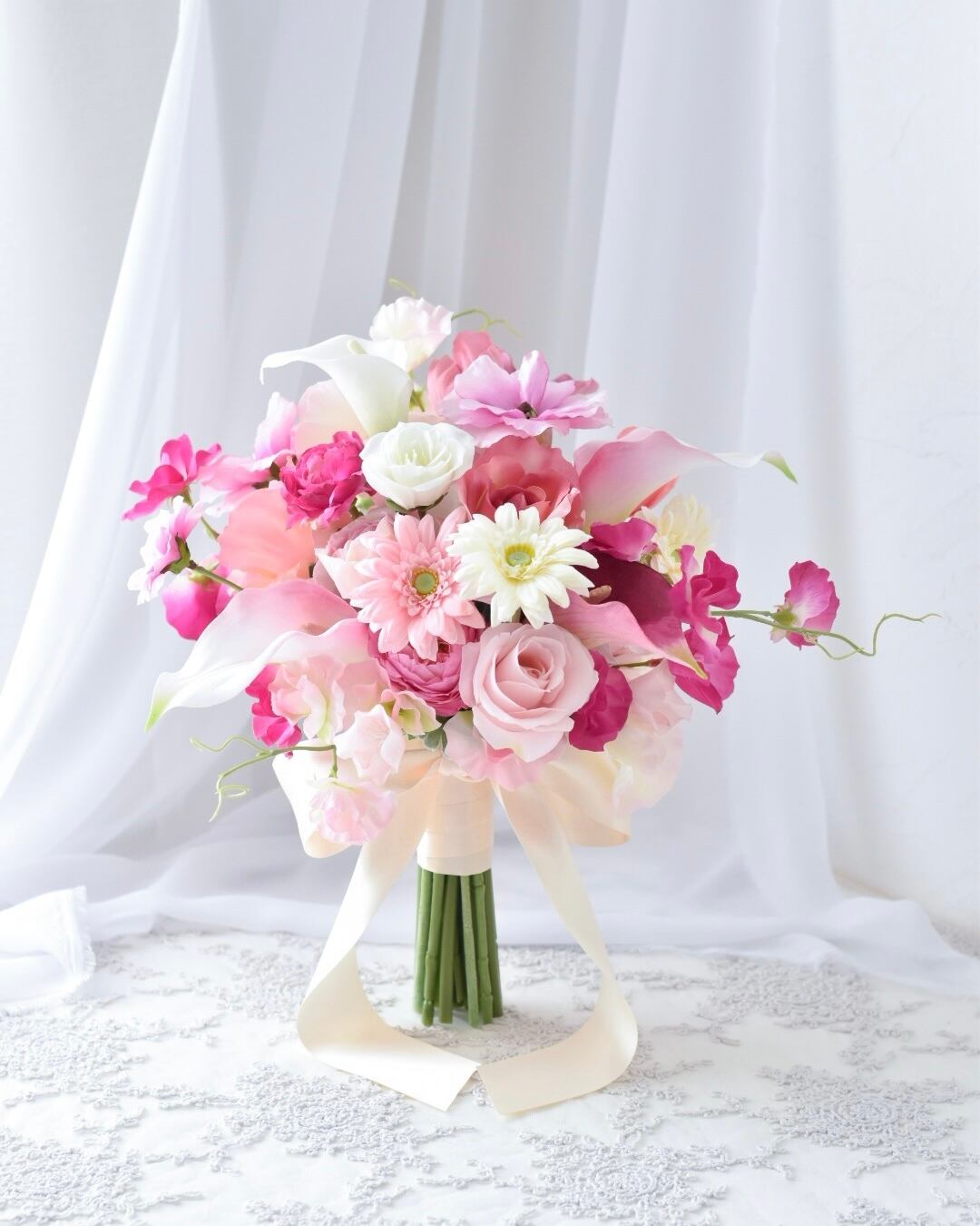 ピンク色と白色のお花で束ねたピンクフルール。色の濃淡でメリハリをつけ、ふんわりと優しくナチュラルに仕上げています。カラーやスイトピーのしなやかさ・ガーベラの可愛らしさ、バラの上品さ!沢山の魅力を詰め込みました。チャーミングなピンクフルールは花嫁様をより華やかに彩ってくれることでしょう。リボンは上品な光沢のあるサテンリボンでお仕立てします!