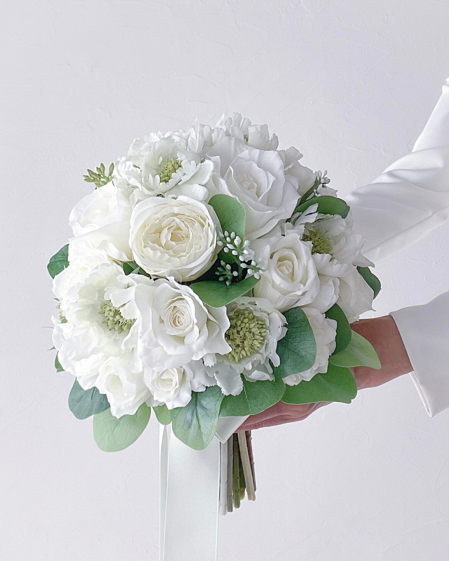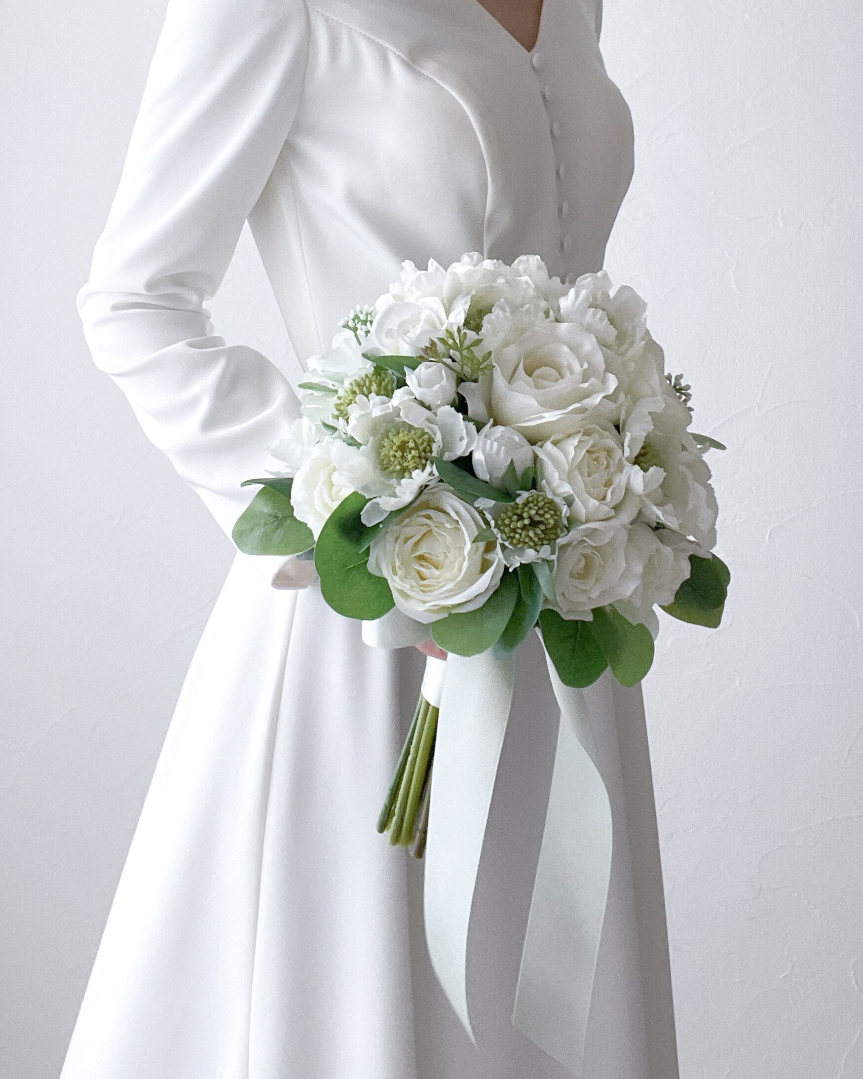 ホワイトグリーンのラウンドクラッチブーケ。スカビオサと数種類の白いバラ、そして鮮やかなグリーン。ナチュラル感や上品さ、優雅さの魅力をたっぷりと味わえる作品です。ブーケ選びに迷われたら、お色はホワイトグリーン、形はラウンドをおすすめいたします。
